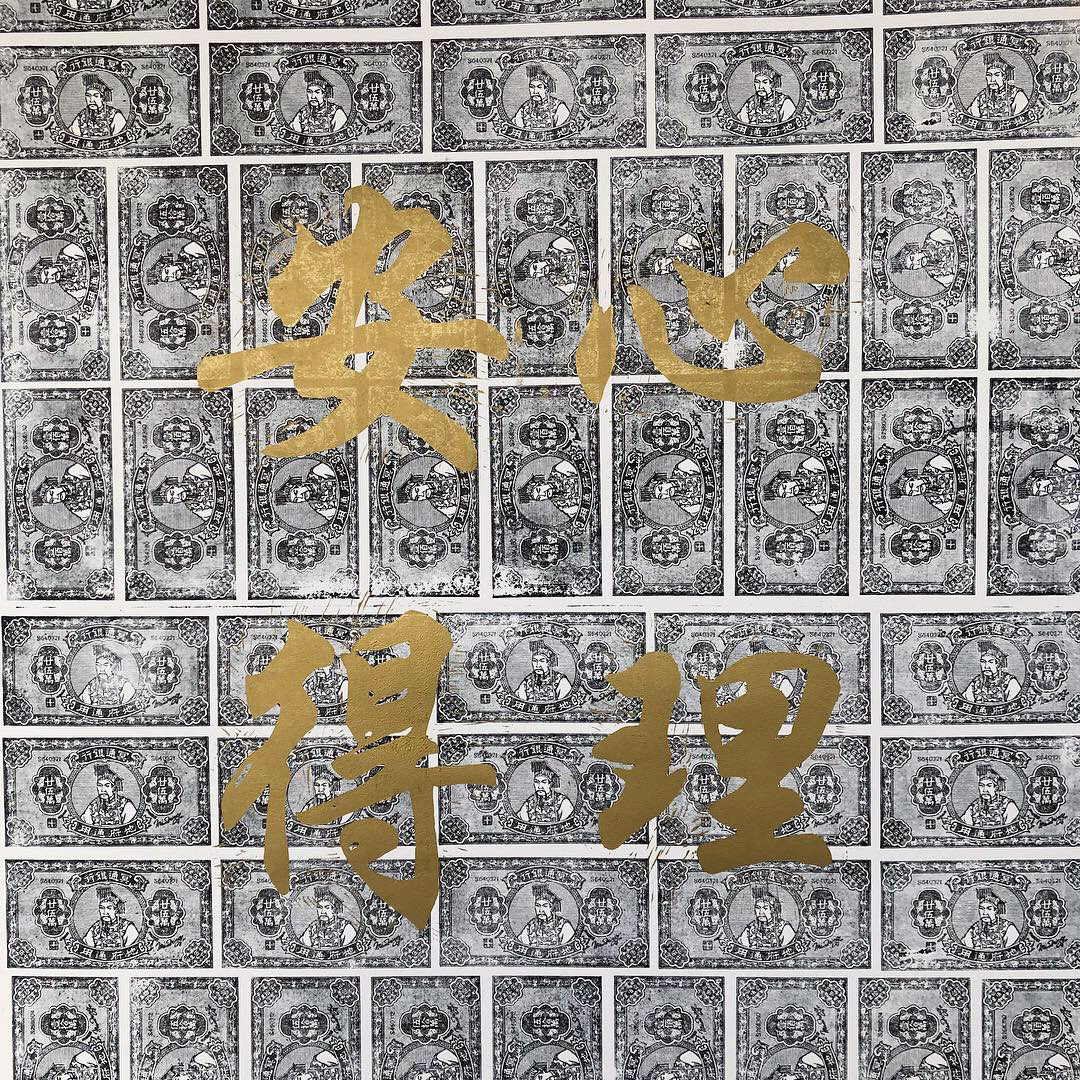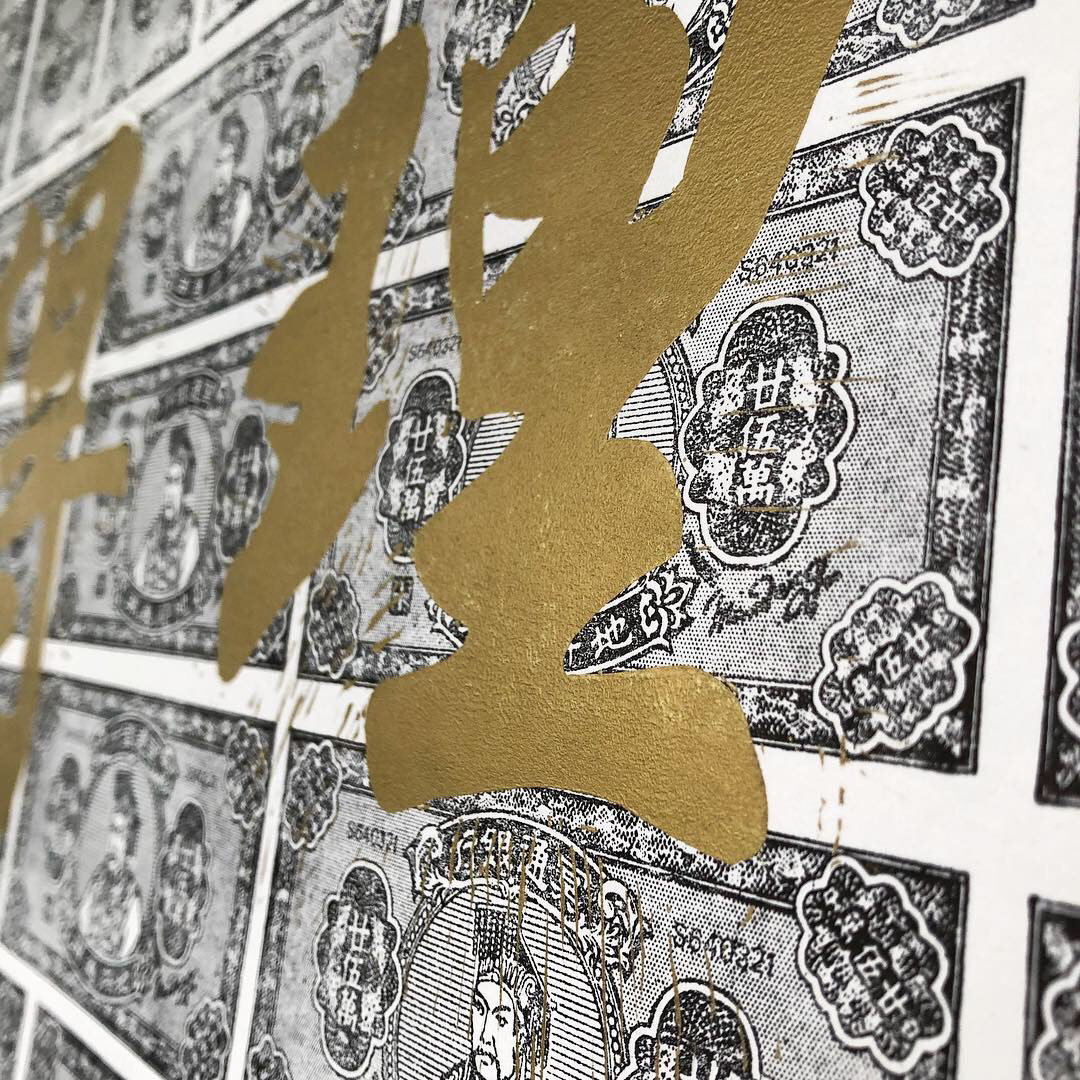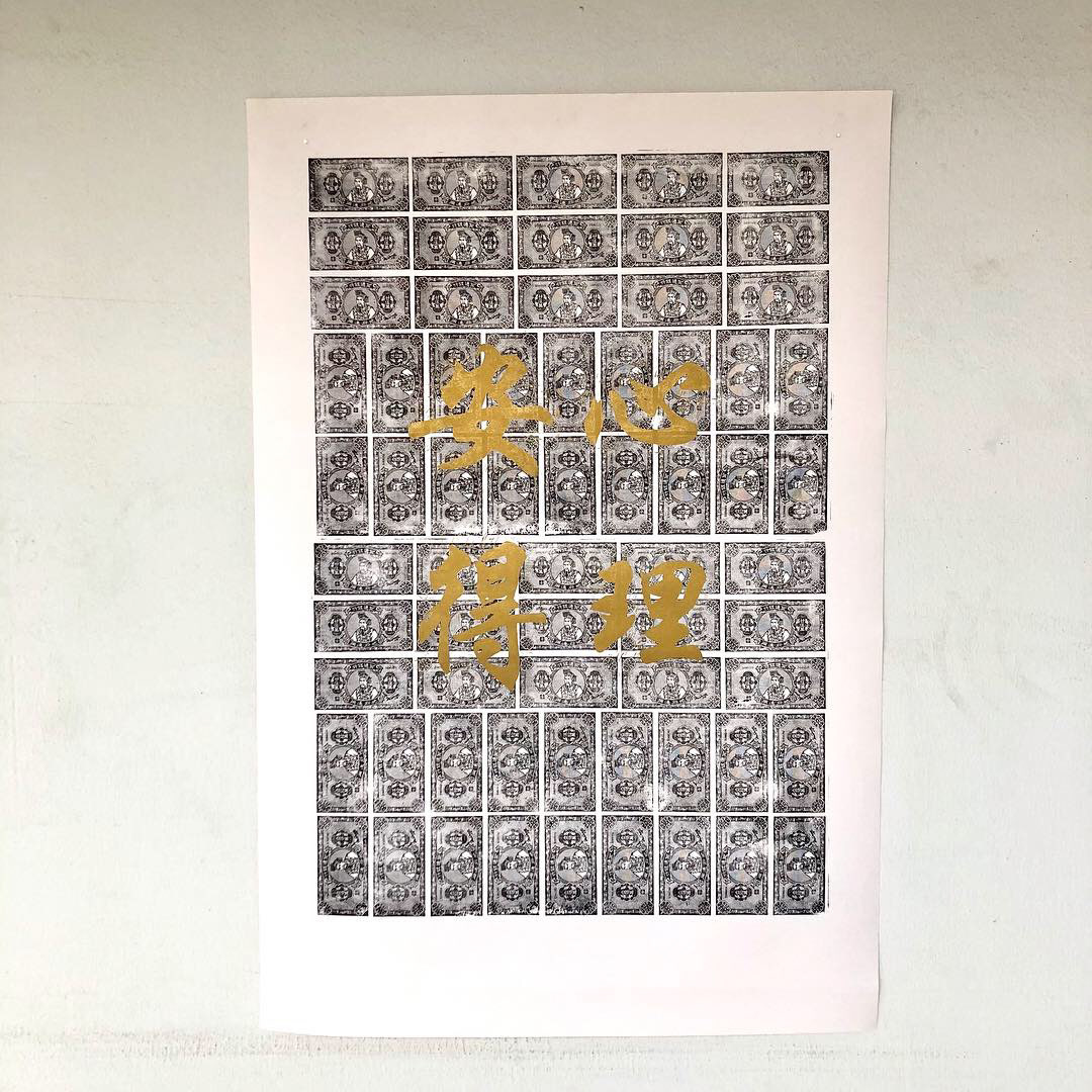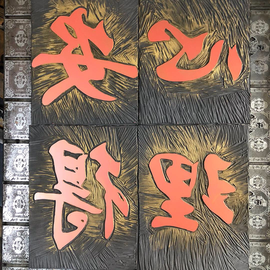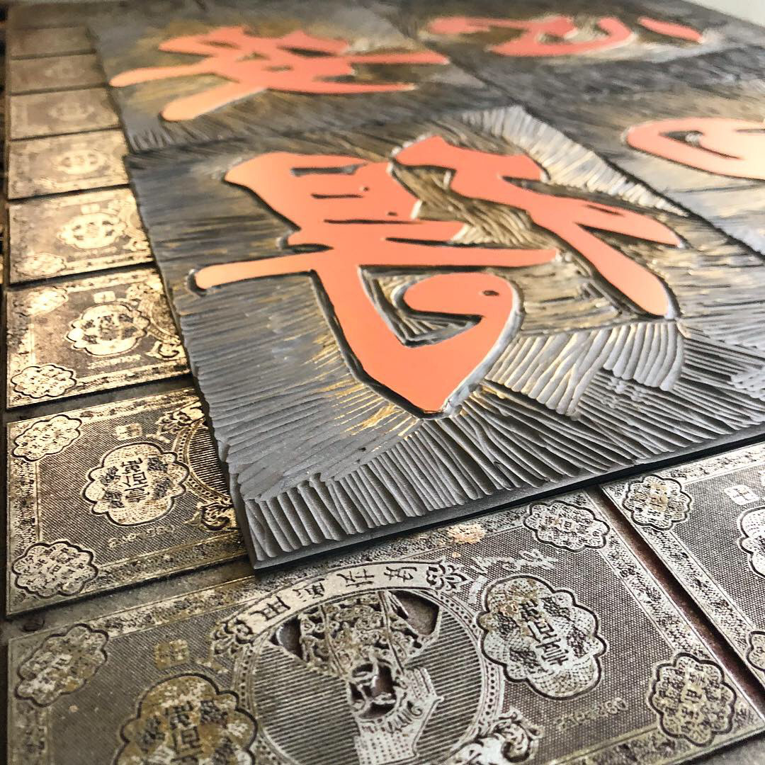 Printed with vintage printing plate from Singapore 70s with Chinese character linocut